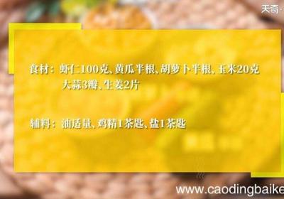 步骤1所需食材:虾仁100克,黄瓜半根,胡萝卜半根,玉米20克,大蒜3瓣,生姜2片 。所需调料:油5克,鸡精1茶匙,盐1茶匙 。步骤2虾仁过水煮熟 。步骤3胡萝卜去皮切丁 。步骤4黄瓜切丁 。步骤5蒜切末 。步骤6生姜切末 。【三色炒虾仁的...