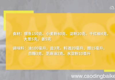 步骤1准备食材:银鱼150克、小麦粉40克、淀粉20克、干红椒4克、、大葱5克、姜5克、油100毫升、盐3克、料酒20毫升、醋15毫升、白糖3克、芝麻油2克、水淀粉10毫升 。步骤2将银鱼洗净、沥干水分备用 。步骤3将小麦粉和淀粉加水调制面...