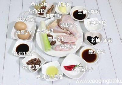 步骤1准备材料:鸡腿2只、鸡蛋2个、鸡翅2只、八角2粒、桂皮1片、草果2个、香叶2片、花椒3克、小米辣2个、大葱1根、姜1块、生抽3茶匙、老抽2茶匙、醋2茶匙、蚝油1茶匙、冰糖5粒、芝麻油1茶匙、盐2茶匙步骤2姜切片 。步骤3葱切段 。步骤...
