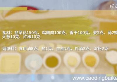 步骤1准备食材:韭菜花150克、鸡胸肉100克、香干100克、姜2克、蒜2瓣、大葱10克、红椒10克、食用油8克、盐1克、生抽2克、鸡精1克、料酒2克、淀粉2克 。步骤2韭菜花洗净、切细段 。步骤3姜切末 。步骤4蒜切片 。步骤5红椒切丝...