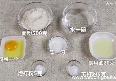 发布时间: 11小时前步骤1食材:面粉500克、水一碗、食用油40克、鸡蛋一个、盐一勺、泡打粉5克、苏打粉5克 。步骤2准备一个大碗,将面粉、鸡蛋、泡打粉、苏打粉、盐和食用油依次倒入碗中;用塑料刮刀将所有食材搅拌成絮状,然后倒入水,用手抓拌、按压揉成面团 。步骤...