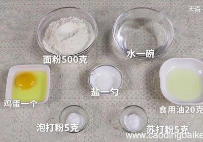 步骤1面粉500克、水一碗、食用油40克、鸡蛋一个、盐一勺、泡打粉5克、苏打粉5克 。步骤2准备一个大碗,将面粉、鸡蛋、泡打粉、苏打粉、盐和食用油依次倒入碗中步骤3用塑料刮刀将所有食材搅拌成絮状,然后倒入水,用手抓拌、按压揉成面团步骤4将揉...