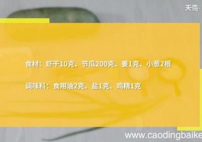 步骤1食材:虾干10克,节瓜200克,姜1克,小葱2根 。调味料:食用油2克,盐1克,鸡精1克 。步骤2虾干温水泡5分钟,捞出沥干 。步骤3姜切末,小葱切葱花 。节瓜去皮,切条 。步骤4热锅倒油,5成热,下姜、虾干,炒香,加节瓜,炒匀 。步...