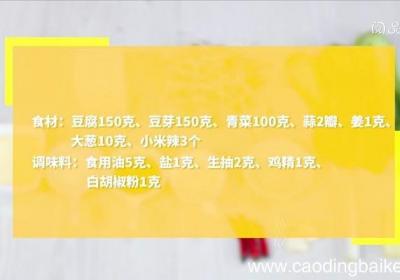 步骤1食材:豆腐150克、豆芽150克、青菜100克、蒜2瓣、姜1克、大葱10克、小米辣3个调味料:食用油5克、盐1克、生抽2克、鸡精1克、白胡椒粉1克步骤2小米辣切末 。步骤3豆芽对半切开 。步骤4豆腐切小方块 。步骤5青菜切小段 。步骤...