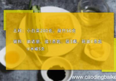 步骤1准备食材:小白菜200克、腐竹50克、油适量、盐1茶匙、蒜3瓣、耗油1茶匙、小米椒5克 。步骤2小白菜洗净切段 。步骤3腐竹泡发切段 。步骤4蒜切片 。步骤5小米椒切圈 。步骤6首先起锅倒油,油温6成热,下入蒜,炒出香味,再倒入小白菜...