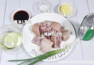 发布时间: 14小时前步骤1准备食材:猪脚200克、盐1茶匙、酱油1茶匙、啤酒1罐、姜1块、油适量、小葱1根 。步骤2猪脚洗净备用 。步骤3小葱切葱花 。步骤4锅中烧热水放入猪脚焯水2分钟 。步骤5起锅倒油,油热加入姜炒香,放入猪脚,放盐炒匀 。【生蒸猪脚的做法...
