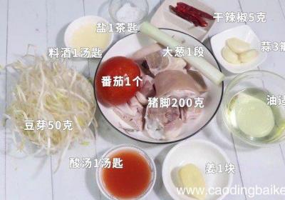 步骤1准备材料:猪脚200克、番茄1个、姜1块、大葱1段、蒜3瓣、豆芽50克、料酒1汤匙、盐1茶匙、干辣椒5克、酸汤1汤匙、油适量 。步骤2【酸汤猪脚的做法 酸汤猪脚怎么做好吃】猪脚洗净备用 。步骤3姜切片 。步骤4番茄切丁 。步骤5大葱切...