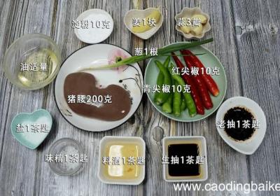步骤1准备食材:猪腰200克、青尖椒10克、葱1根、红尖椒10克、淀粉10克、姜1块、蒜3瓣、油适量、盐1茶匙、味精1茶匙、料酒1茶匙、生抽1茶匙、老抽1茶匙 。步骤2猪腰洗净去筋膜,打个花刀切块 。步骤3青尖椒切圈 。步骤4红尖椒切圈 。...
