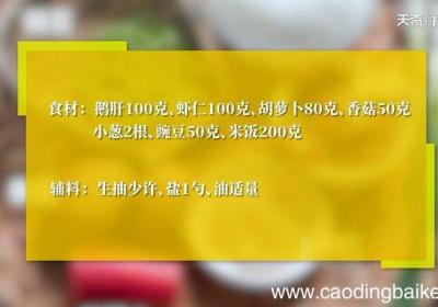 步骤1食材: 鹅肝100克、虾仁100克、胡萝卜80克、香菇50克、小葱2根、豌豆50克、米饭200克、 生抽少许、盐1勺、油适量 。步骤2鹅肝切丁 。步骤3虾仁去虾线切丁 。步骤4胡萝卜切丁 。步骤5香菇洗净切丁 。步骤6小葱切葱花 。步...