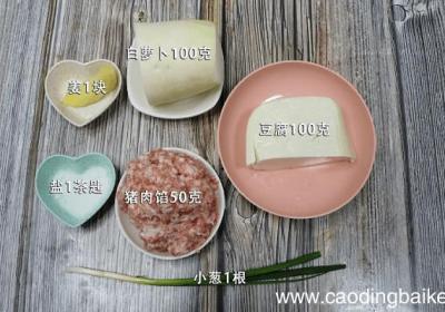 步骤1准备食材:白萝卜100克、猪肉馅50克、豆腐100克、姜1块、小葱1根、盐1茶匙 。步骤2白萝卜去皮切丝 。步骤3姜切末 。步骤4小葱切葱花 。步骤5首先将猪肉和豆腐放入容器中,加入姜末、盐 。步骤6然后把豆腐和猪肉抓至混合,再捏成丸...
