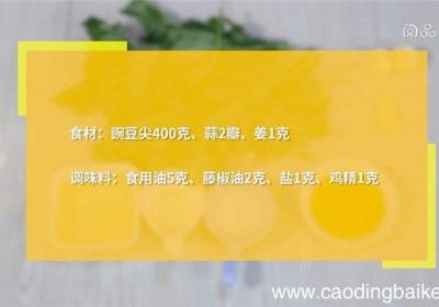 步骤1食材:豌豆尖400克、蒜2瓣、姜1克调味料:食用油5克、藤椒油2克、盐1克、鸡精1克步骤2蒜切片 。步骤3姜切丝 。步骤4豌豆尖洗净、沥干 。步骤5热锅倒油、油温5成热时、下姜、蒜、盐、炒香、加藤椒油、炒匀、放豌豆尖、鸡精、炒匀即可...
