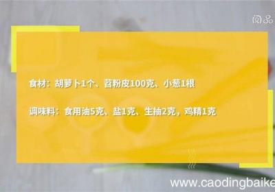 步骤1食材:胡萝卜1个、苕粉皮100克、小葱1根调味料:食用油5克、盐1克、生抽2克,鸡精1克步骤2苕皮放入温水中浸泡10分钟左右 。步骤3泡软后捞出,沥干,切块 。步骤4胡萝卜切丝 。步骤5小葱切葱花 。【苕粉皮炒胡萝卜丝的做法 苕粉皮炒...