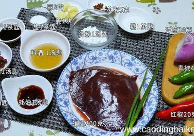 步骤1准备食材:猪肝300克、洋葱30克、青椒40克、红椒20克、花椒5克、蒜3瓣、姜1块、盐1茶匙、老抽1汤匙、料酒1汤匙、淀粉1汤匙、蚝油1汤匙、糖1茶匙、豆瓣酱1汤匙、醋1茶匙 。【爆炒猪肝的做法 怎么做爆炒猪肝】步骤2洋葱切块 。步...