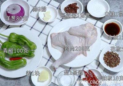 步骤1准备食材:青椒100克、鸡肉200克、姜1块、花椒5克、干辣椒10克、洋葱80克、蒜3瓣、生抽1汤匙、白糖1茶匙、盐1茶匙、豆瓣酱1汤匙 。步骤2姜切片 。步骤3青椒切块 。步骤4洋葱切块 。步骤5干辣椒切段 。步骤6蒜切片备用 。步...