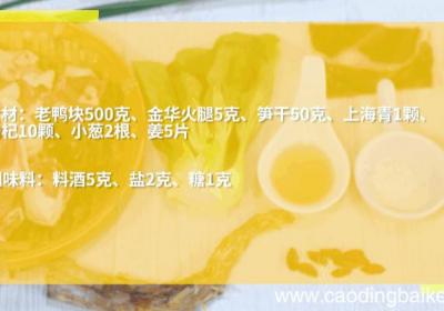 步骤1准备食材:老鸭块500克、金华火腿5克、笋干50克、上海青1颗、枸杞10颗、小葱2根、姜5片、料酒5克、盐2克、糖1克 。步骤2笋干用温水泡发30分钟 。步骤3上海青洗净、对半切开 。步骤4锅中水沸、下小葱、料酒、鸭块、焯水10分钟、...