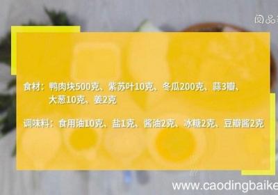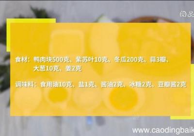 步骤1食材:鸭肉块500g、紫苏叶10克、冬瓜200克、蒜3瓣、大葱10克、姜2克 。调味料:食用油10克、盐1克、酱油2克、冰糖2克、豆瓣酱2克 。步骤2鸭肉块洗净 。步骤3紫苏叶切丝 。步骤4冬瓜去皮、去瓤、切块 。步骤5蒜对半切开 。...