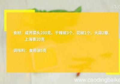 步骤1食材:咸荠菜头200克、干辣椒3个、花椒1个、大蒜2瓣、上海青20克 。调味料:食用油5克 。步骤2上海青对半切开,放入沸水锅中焯烫40秒,捞出备用 。【炒咸辣菜怎么做 炒咸辣菜的做法】步骤3咸荠菜头切丝 。步骤4干辣椒切段 。步骤5...