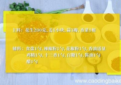 步骤1主料:花生200克、姜1小块、蒜3瓣、香菜1根 。辅料:食盐1勺、辣椒粉1勺、花椒粉1勺、香油适量、鸡精1勺、十三香1勺、白糖1勺、酱油1勺、醋1勺 。步骤2先将花生放入清水中洗净 。步骤3锅中加水,加入少量食盐,将花生倒入锅中,煮8...