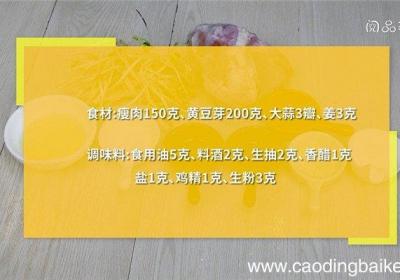 步骤1食材:瘦肉150克、黄豆芽200克、大蒜3瓣、姜3克 。调味料:食用油5克、料酒2克、生抽2克、香醋1克、盐1克、鸡精1克、生粉3克 。步骤2瘦肉切丝 。步骤3加入料酒、生粉,拌匀,腌制10分钟 。步骤4大蒜切片 。步骤5姜切丝 。步...