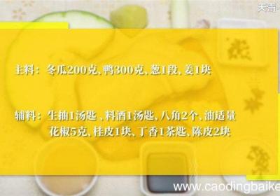 步骤1准备食材:冬瓜200克,鸭300克,姜1块,葱1段,八角2个,花椒5克,桂皮1块,丁香1茶匙,陈皮2块、生抽1汤匙,料酒1汤匙步骤2将鸭肉斩成块 。步骤3姜切片 。步骤4葱切段 。步骤5冬瓜去皮,切成约2厘米厚的方块 。步骤6锅内倒入...