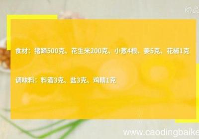 步骤1食材:猪蹄500克、花生米200克、小葱4根、姜5克、花椒1克 。调味料:料酒3克、盐3克、鸡精1克 。步骤2猪蹄剁块,冷水入锅,放入料酒、花椒,煮5分钟,捞出 。步骤3小葱3根打葱结 。步骤41根切葱花 。步骤5姜切片 。步骤6砂锅...