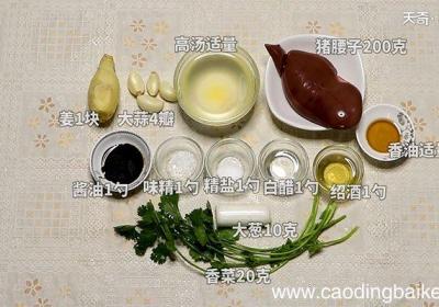 步骤1准备材料:猪腰子200克、香菜20g、大葱10g、姜1小块、大蒜4瓣、精盐1勺、味精1勺、白醋1勺、酱油1勺、绍酒1勺、香油适量、高汤适量 。步骤2将猪腰子切成两半,除去腰臊 。步骤3然后先竖着切直花刀,再斜着切花刀,最后切成小条备用...