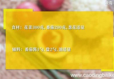 发布时间: 14小时前步骤1食材: 花菜300克、番茄200克、葱花适量 。辅料: 番茄酱1勺、盐2勺、油适量 。步骤2花菜切小朵 。步骤3加入清水,加盐1勺浸泡10分钟,锅中水沸后,花菜放入沸水中焯水 。步骤4番茄顶部切十字,加入热水去皮,再切小丁 。步骤5锅...