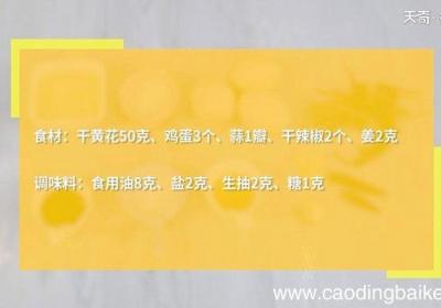 步骤1食材:干黄花50克、鸡蛋3个、蒜1瓣、干辣椒2个、姜2克调味料:食用油8克、盐2克、生抽2克、糖1克步骤2干黄花用温水浸泡10分钟、捞出沥干、切段 。步骤3鸡蛋打散备用 。步骤4蒜切片 。步骤5干辣椒剪断 。【干黄花菜的做法 干黄花菜...