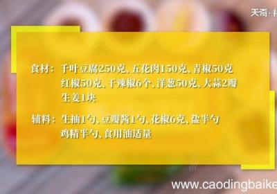 步骤1【干锅千页豆腐的做法 干锅千页豆腐怎么做】所需食材:千页豆腐250克,青椒1个,五花肉150克,红椒50克,洋葱50克,大蒜2瓣,生姜1块 。所需调料:生抽1汤匙,豆瓣酱1汤匙,花椒6克,干辣椒6个,盐半茶匙,鸡精半茶匙 。步骤2红椒...
