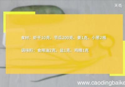步骤1食材:虾干10克,节瓜200克,姜1克,小葱2根 。调味料:食用油2克,盐1克,鸡精1克 。步骤2虾干温水泡5分钟,捞出沥干 。步骤3姜切末,小葱切葱花 。节瓜去皮,切条 。步骤4热锅倒油,5成热,下姜、虾干,炒香,加节瓜,炒匀 。步...