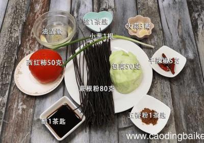 步骤1准备食材:蕨根粉80克、西红柿50克、包菜50克、油适量、盐1茶匙、大蒜3瓣、干辣椒5克、五香粉1茶匙、醋1茶匙、小葱1根 。步骤2西红柿洗净切片 。步骤3包菜洗净切丝 。步骤4蕨根粉泡软 。步骤5大蒜切片 。步骤6干辣椒切段 。步骤...