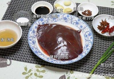 步骤1准备食材:猪肝300克、葱10克、姜1块、蒜5克、八角2个、花椒10克、干辣椒3个、料酒1汤匙、盐1茶匙、海鲜酱油3汤匙 。步骤2葱切段 。步骤3姜切片 。步骤4蒜切末 。步骤5猪肝凉水下锅焯水,煮出血水 。步骤6猪肝表面由深红色变成...