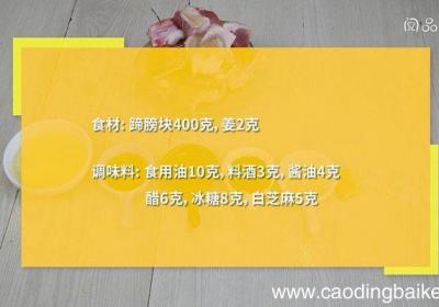 发布时间: 15小时前步骤1食材:蹄膀块400克,姜2克 。调味料:食用油10克,料酒3克,酱油4克,醋6克,冰糖8克,白芝麻5克 。步骤2姜切片 。步骤3【糖醋蹄膀的做法,糖醋蹄膀怎么做】锅中倒入清水,放入蹄膀块、料酒、姜片,大火煮沸后,继续煮15分钟,捞出...