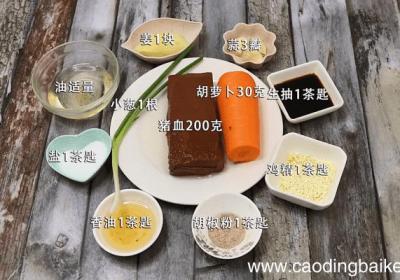 步骤1准备食材:猪血200克、胡萝卜30克、油适量、盐1茶匙、姜1块、蒜3瓣、生抽1茶匙、鸡精1茶匙、胡椒粉1茶匙、香油1茶匙、小葱1根 。步骤2猪血洗净切片 。步骤3姜切片 。步骤4蒜切片 。步骤5胡萝卜去皮切片 。步骤6小葱切葱花 。步...