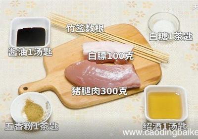 步骤1【串烤五香肉怎么做 串烤五香肉的做法】准备食材:猪腿肉300克,白膘100克,酱油1汤匙,绍酒1汤匙,白糖1茶匙,竹签6根,五香粉1茶匙步骤2将猪腿肉切成直径4厘米的圆形夹刀片 。步骤3白膘切成片备用 。步骤4猪腿肉加入五香粉、白糖、...