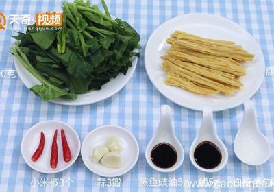 腐竹拌菠菜食材:菠菜200克、腐竹50克、小米椒、蒜、盐、糖、醋、蒸鱼豉油 。步骤:1.腐竹放入清水中浸泡30分钟,将菠菜洗净,用刀将菜梗从根部切开,小棵一分为二,大棵一分为四 。将腐竹切段,小米椒切圈,大蒜切蒜末 。2.锅中放入适量水烧开...