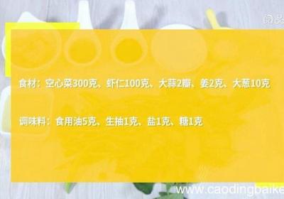 步骤1食材:空心菜300克、虾仁100克、大蒜2瓣、姜2克、大葱10克 。调味料:食用油5克、生抽1克、盐1克、糖1克 。步骤2空心菜从尾部掐断、杆不用、掐好的空心菜尾部洗净、沥干 。步骤3大蒜切末 。步骤4姜切末 。步骤5大葱切片 。步骤...