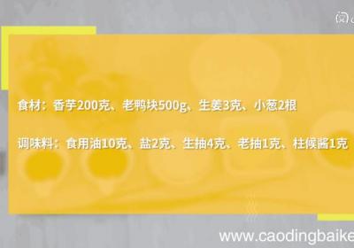步骤1准备食材:香芋200克、老鸭块500克、生姜3克、小葱2根、食用油10克、盐2克、生抽4克、老抽1克、柱候酱1克 。步骤2老鸭块洗净、沥水备用 。步骤3香芋洗净、切滚刀块 。步骤4姜切片 。步骤5小葱切葱花 。步骤6热锅倒油、油温5成...
