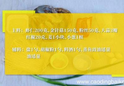 步骤1主料:虾仁200克、金针菇150克、粉丝50克、大蒜3瓣、红椒20克、小葱1根、姜1小块 。辅料:油适量、盐1勺、胡椒粉1勺、料酒1勺、蒸鱼豉油适量 。步骤2金针菇切掉头部,撕成小朵 。步骤3大蒜切末 。步骤4切少许姜片,再切少量姜末...