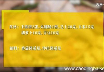 【手抓饼披萨的做法 手抓饼披萨怎么做】步骤1食材:小麦面粉100克,火腿肠1根,芝士20克,玉米15克,胡萝卜10克,青豆10克 。调料:番茄酱1汤匙,沙拉酱1汤匙 。步骤2将火腿肠放入饼皮上 。步骤3卷起来,切成块 。步骤4再放在饼皮上,...