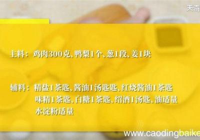 【鸭梨鸡怎么做 鸭梨鸡的做法】步骤1准备食材:鸡肉300克,鸭梨1个,葱1块,姜2瓣,盐1茶匙,酱油1茶匙,,味精1茶匙,白糖1茶匙,绍酒1汤匙,水淀粉1茶匙,色拉油1茶匙步骤2鸡肉去骨,剁成三角块,鸭梨去皮,切成小块,去核,葱、姜拍松备用...