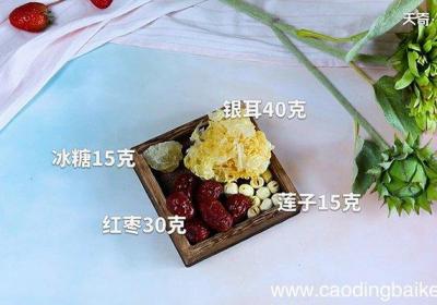 步骤1准备食材:银耳40克、红枣30克、莲子15克、冰糖15克 。步骤2先将银耳放入水中,浸泡30分钟 。步骤3然后将银耳去蒂,撕成小朵 。步骤4锅中烧水,将银耳放入锅内,加入莲子红枣,用中火炖30分钟 。步骤5最后加入冰糖,搅拌均匀 。步...