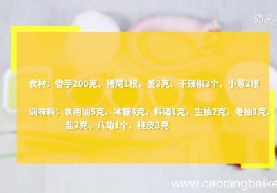 步骤1食材:香芋200克、猪尾1根、姜3克、干辣椒3个、小葱2根调味料:食用油5克、冰糖4克、料酒1克、生抽2克、老抽1克、盐2克、八角1个、桂皮3克步骤2芋头洗净切块 。小葱切葱花 。步骤3猪尾剁块,姜切片 。【香芋炖猪尾的做法 香芋炖猪...