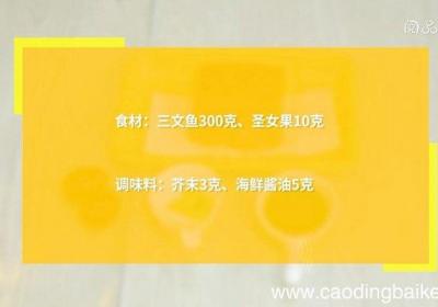 步骤1食材:三文鱼300克、圣女果10克 。调味料:芥末3克、海鲜酱油5克 。步骤2菜刀、案板清洗干净,三文鱼放案板上切片 。步骤3圣女果对半切开 。步骤4将切好的三文鱼摆入盘中,放入圣女果摆盘装饰 。步骤5蘸碟中放入芥末、海鲜酱油,搭配三...