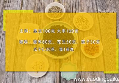 步骤1准备食材:黑豆100克 大米100克、薏米60克、花生50克、莲子50克、瓜子仁30克、糖1茶匙 。步骤2黑豆用温水浸泡1小时 。步骤3大米洗净备用 。步骤4首先将泡好的黑豆放入砂锅,再加入薏米、花生、莲子、瓜子仁,再倒入适量清水,大...