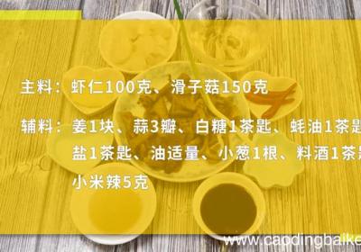 步骤1准备食材:虾仁100克、滑子菇150克、姜1块、蒜3瓣、白糖1茶匙、蚝油1茶匙、盐1茶匙、油适量、小葱1根、料酒1茶匙、小米辣5克 。步骤2滑子菇洗净备用 。步骤3姜切片 。步骤4蒜切片 。步骤5小葱切葱花 。步骤6小米辣切圈 。步骤...