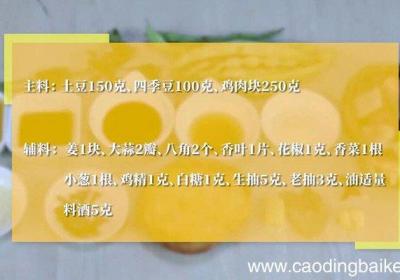 步骤1主料:土豆150克、四季豆100克、鸡肉块250克 。辅料:姜1块、大蒜2瓣、八角2个、香叶1片、花椒1克、香菜1根、小葱1根、鸡精1克、白糖1克、生抽5克、老抽3克、料酒5克、油适量 。步骤2土豆去皮洗净,切滚刀块 。步骤3放入清水...