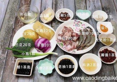 步骤1准备食材:排骨200克、基围虾100克、油适量、土豆20克、莲藕30克、西兰花20克、洋葱20克、蒜3瓣、花椒5克、盐1茶匙、料酒2茶匙、老抽1茶匙、白糖2茶匙、醋1茶匙、胡椒粉1茶匙、椒盐1茶匙、孜然粉1茶匙、豆瓣酱1茶匙、小葱1根...