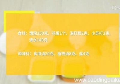 步骤1食材:面粉250克、鸡蛋1个、泡打粉2克、小苏打2克、清水140克 。调味料:食用油20克、植物油8克、盐4克 。步骤2盆中放入面粉、泡打粉、小苏打、盐,拌匀,加入鸡蛋、植物油,分3次加入清水拌匀,揉成面团 。步骤3面团醒发15分钟,...