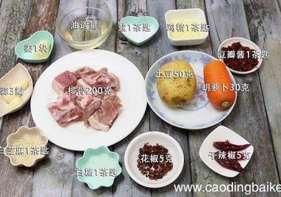步骤1准备食材:排骨200克、土豆50克、胡萝卜30克、油适量、盐1茶匙、鸡精1茶匙、豆瓣酱1茶匙、干辣椒5克、花椒5克、白糖1茶匙、白芝麻1茶匙、姜1块、蒜3瓣步骤2排骨洗净(提前叫老板处理好) 。步骤3土豆去皮切小块 。步骤4胡萝卜洗净...